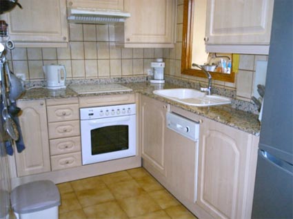 Utility room and fully fitted kitchen with door leading to a large paved terrace with magnificent views over the country side and mountains.